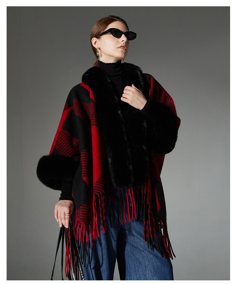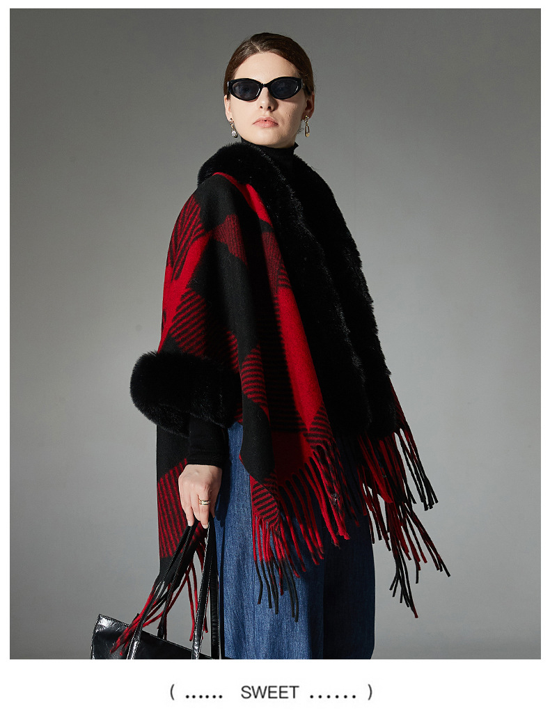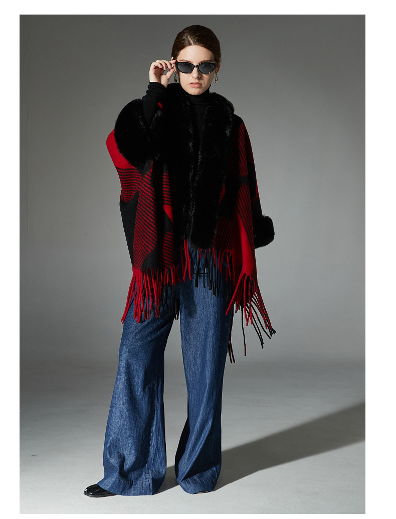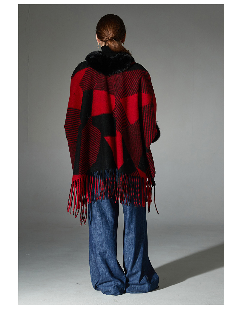 Jacquard Christmas Red Fur Collar Geometric Tassel Shawl