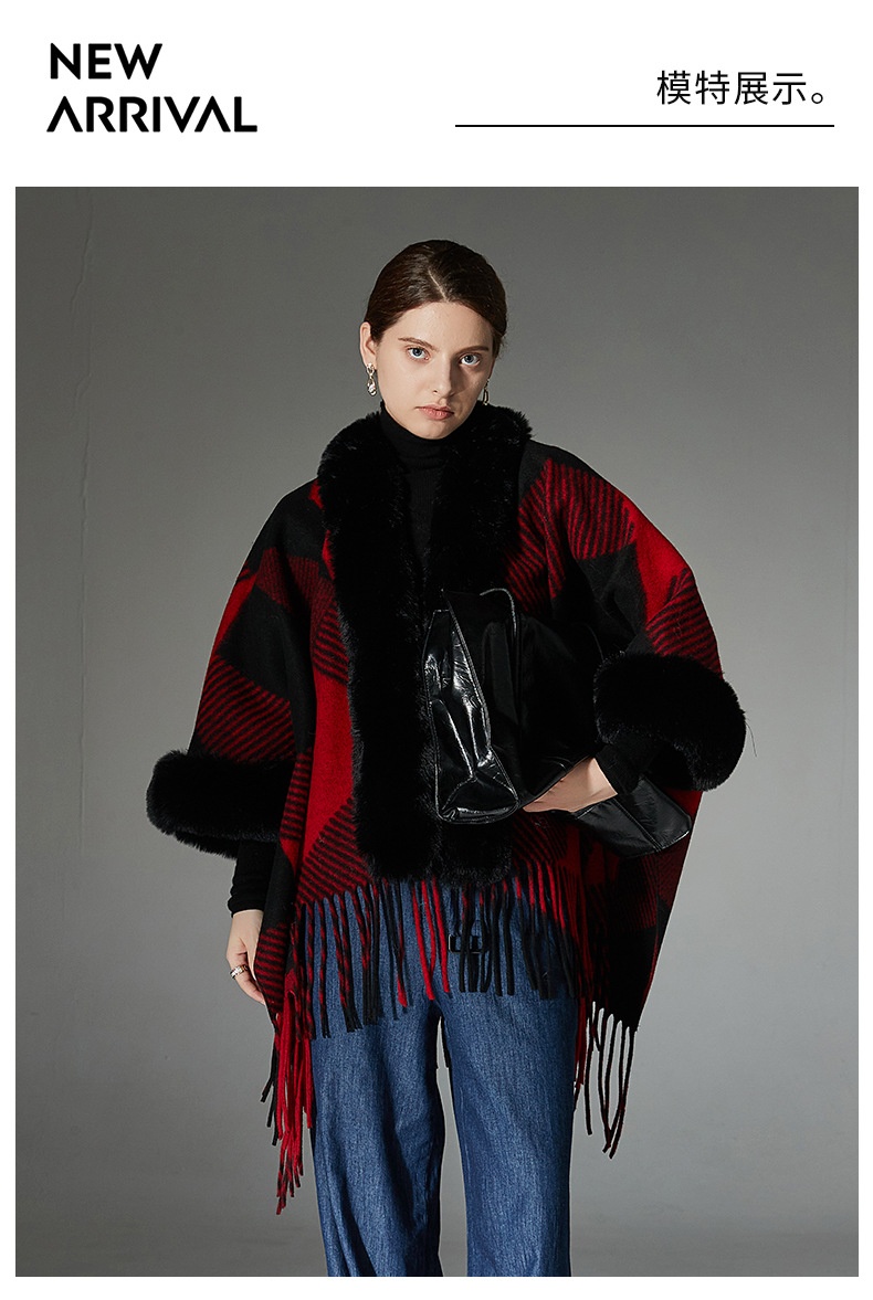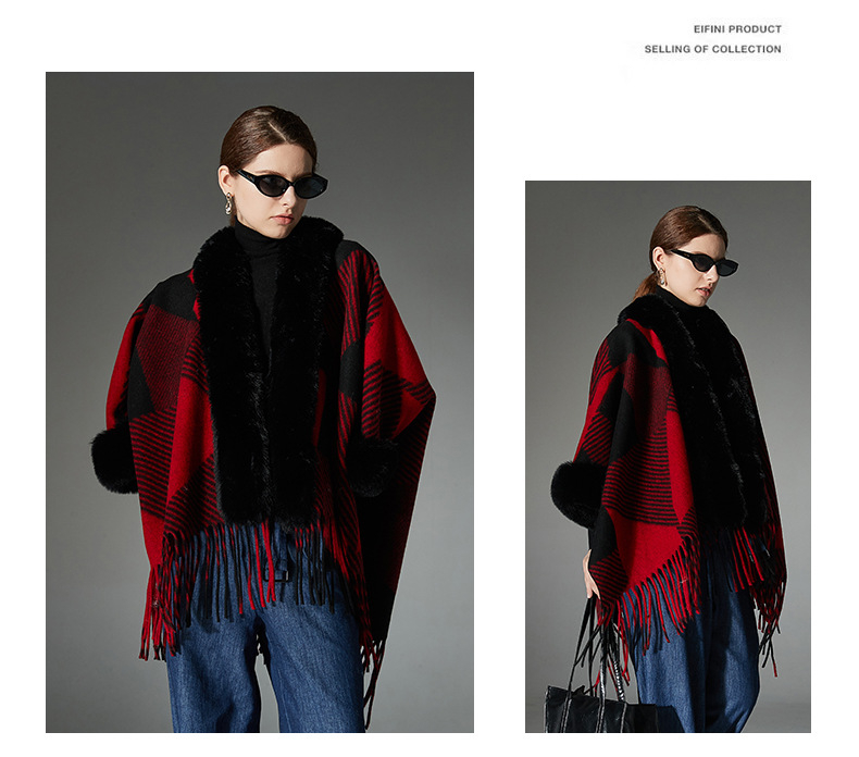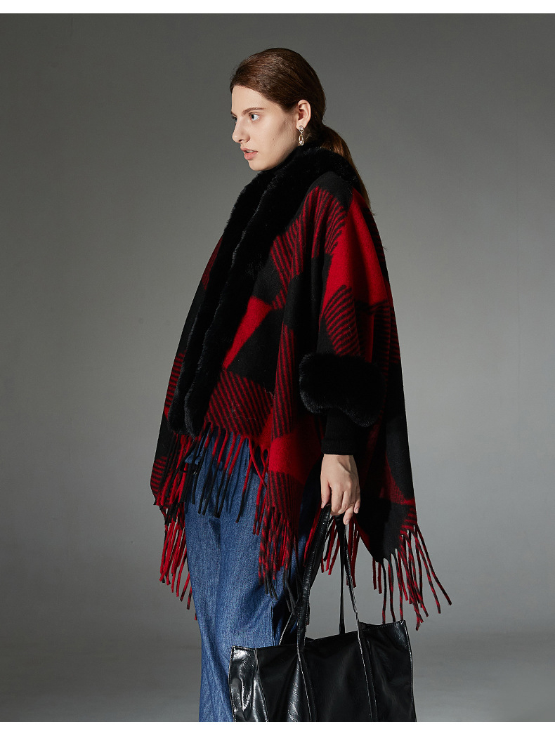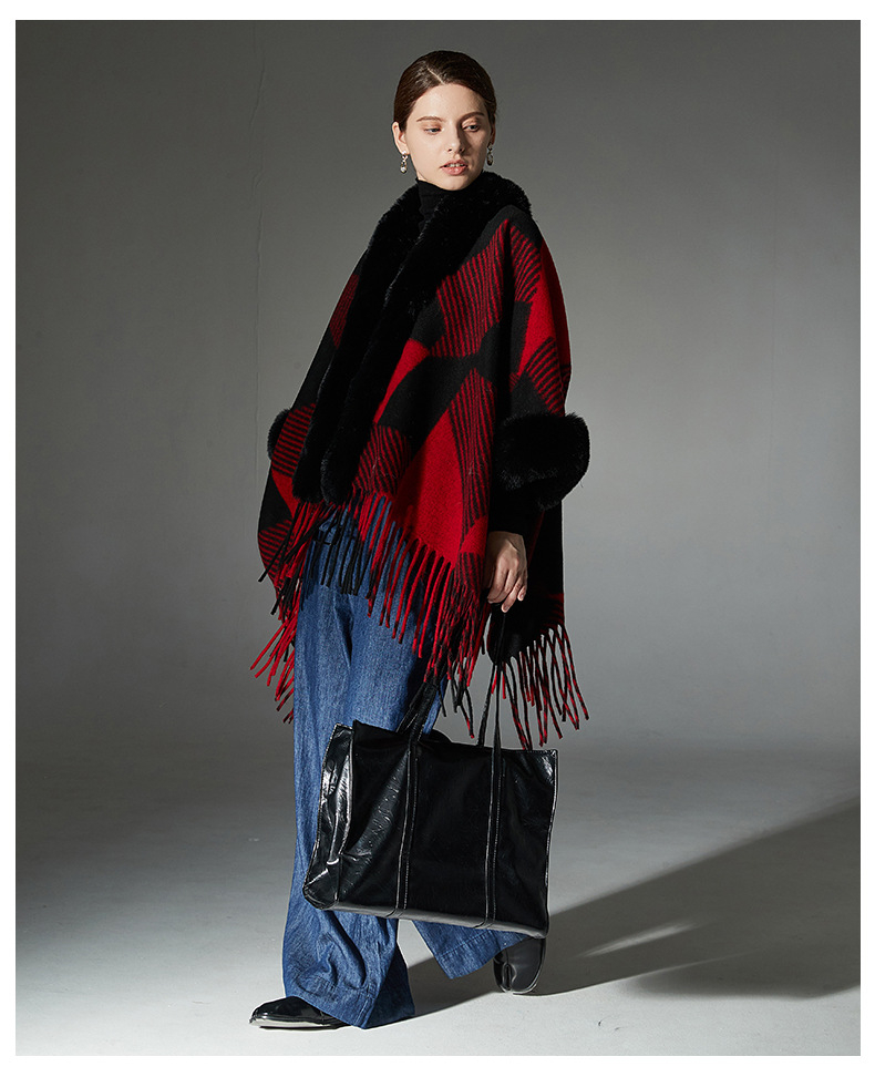 Jacquard Christmas Red Fur Collar Geometric Tassel Shawl