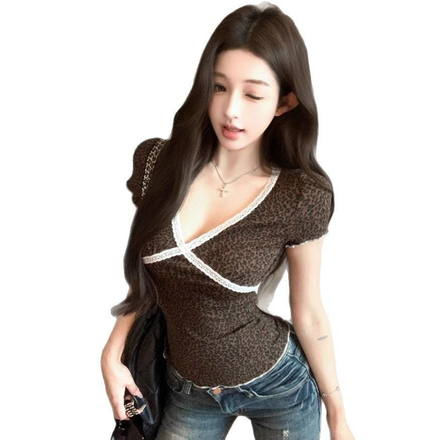V-neck Lace Leopard-print Slim-fit Short Sleeve Women's Summer