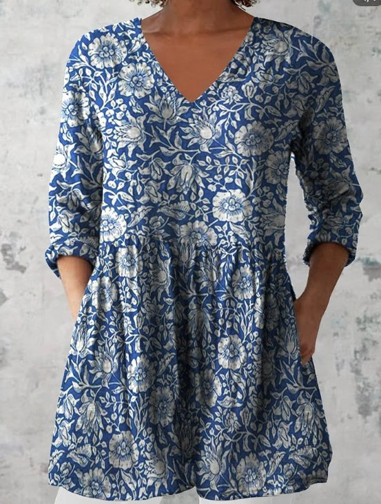 Women's Retro Floral Print Casual Cotton Linen V-neck Top